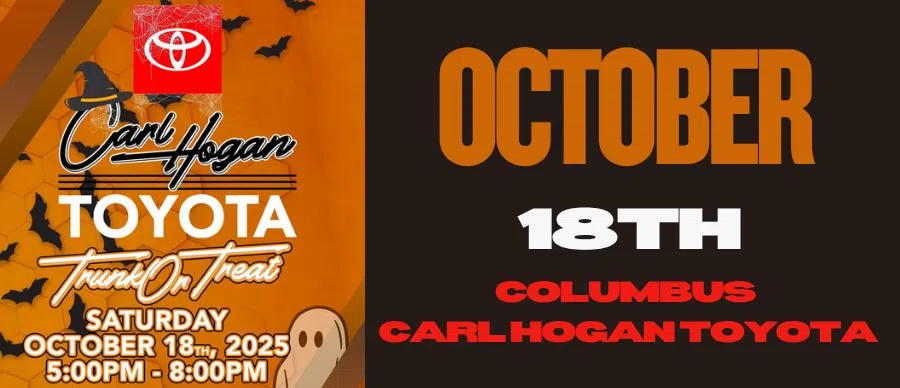 Carl Hogan Toyota Trunk or Treat Saturday October 18th Join us for Trunk-or-Treat at Carl Hogan Toyota on October 18th from 5 to 8pm! Bring the family, dress up, and enjoy a night of Halloween fun, candy, and creativity. Don’t miss out on this spooky good time. Come celebrate with us at Carl Hogan Toyota!